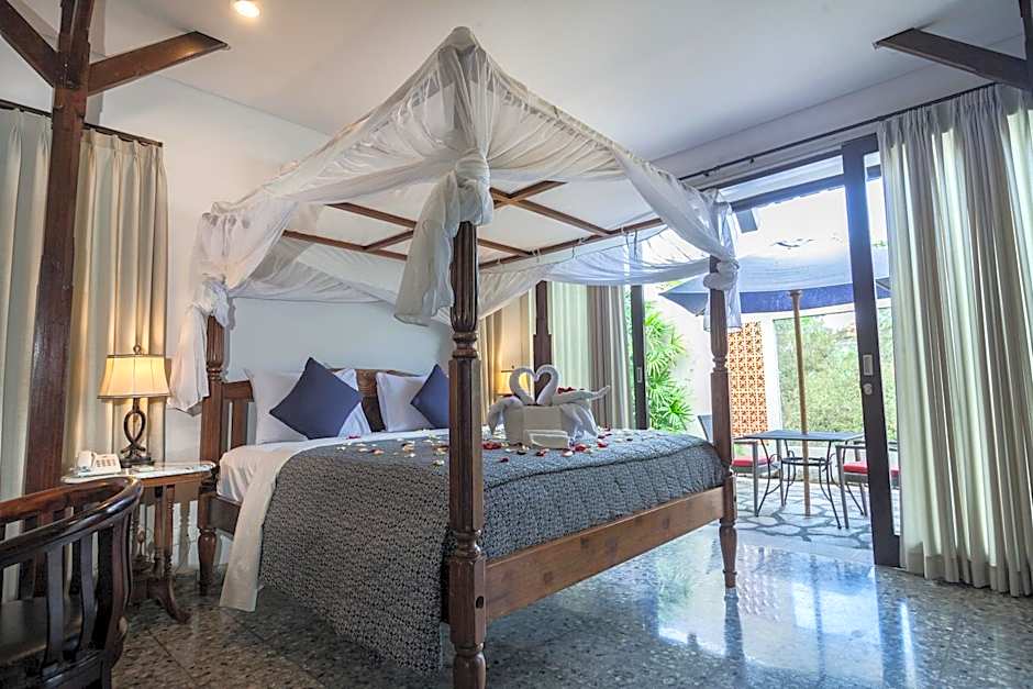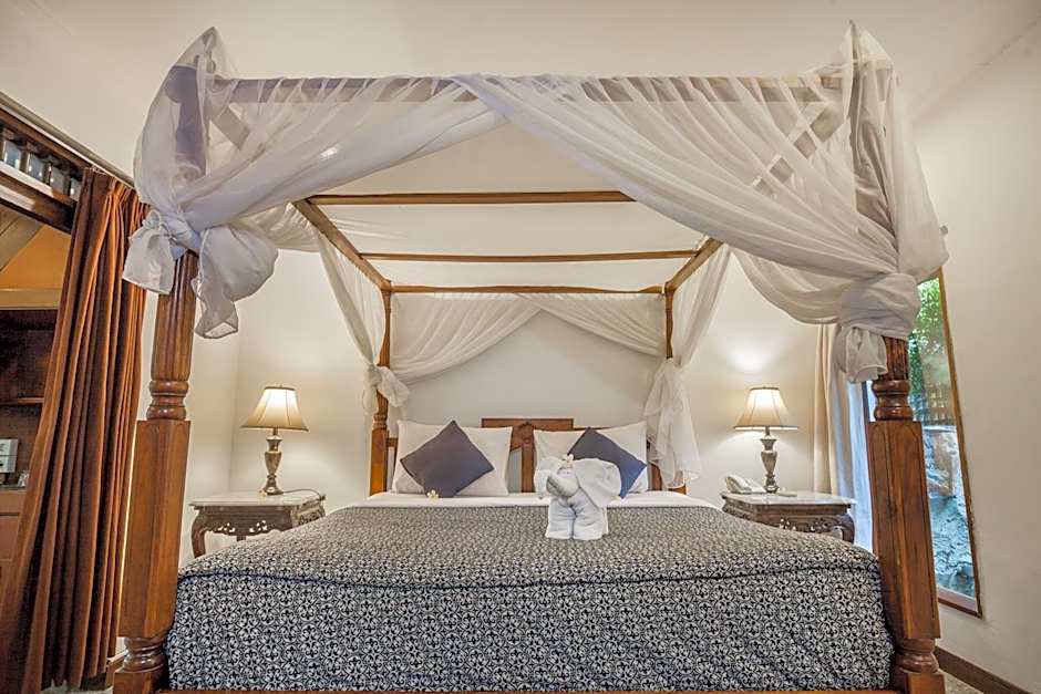 It also has a satellite TV with DVD player, 4-poster bed with mosquito nets, and a private terrace with views of the surrounding rice fields.